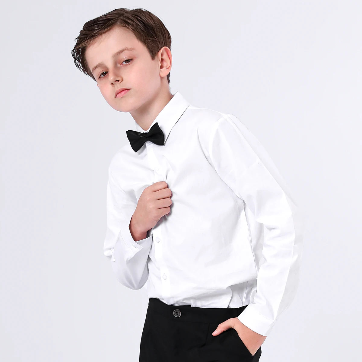 Boys Dress Shirt Kids School Uniform Long Sleeve with Bowtie Formal Gentleman Gift Perform Ceremony Clothes White 6 to 14 years